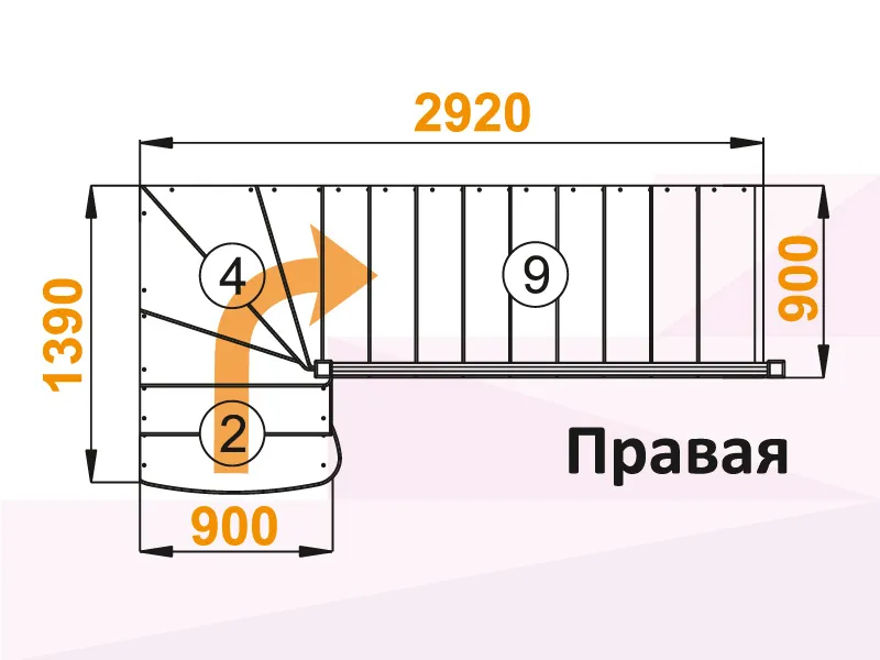 Поворот осуществлён с помощью 4х забежных ступеней, первая ступень лестницы пригласительная (скруглены внешние углы)