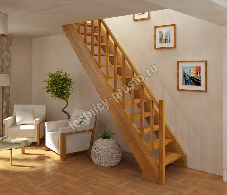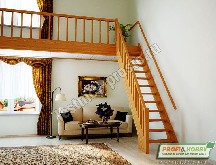 Базовый комплект включает в себя деревянные элементы лестницы и ограждения без какого-либо покрытия. Ограждение можно установить слева или справа. Увеличить высоту лестницы можно установив снизу подиум, точная подгонка высоты под необходимые параметры осуществляется засчет регулировки верхнего шага лестницы.