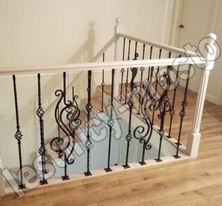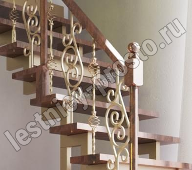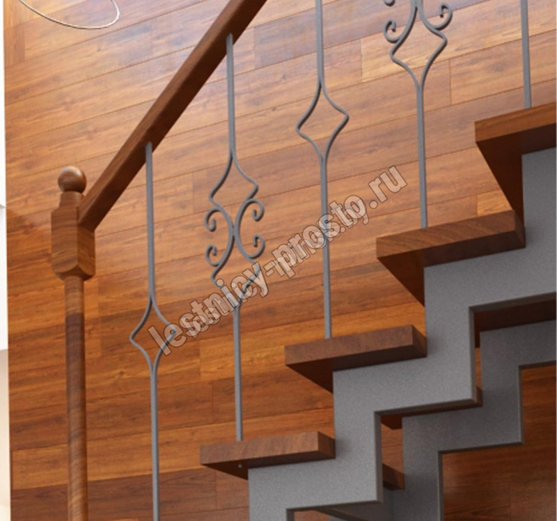Деревянные элементы: столбы и поручень по умолчанию идут без окрашивания, металлические элементы окрашены в цвет каркаса лестницы. Ограждение начинается с пятой ступени. Комплект предполагает размещение по  одной стойке на ступень.