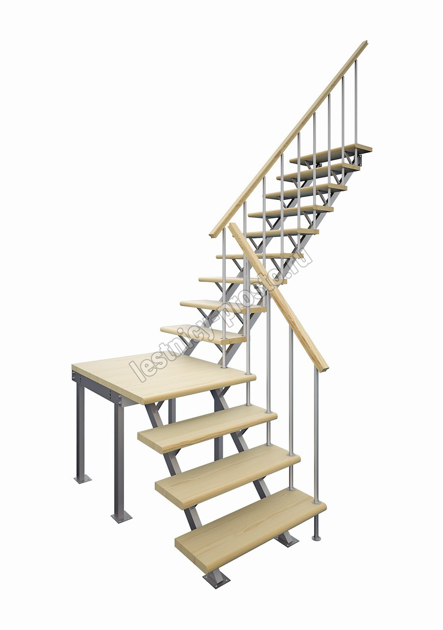 Универсальная лестница на металлическом каркасе с поворотной площадкой. Идеально дополнит любой интерьер, имеет современный вид и удобна в использовании. Монтаж осуществляется силами двух человек на объекте по указаниям, приведенным в паспорте на лестницу.