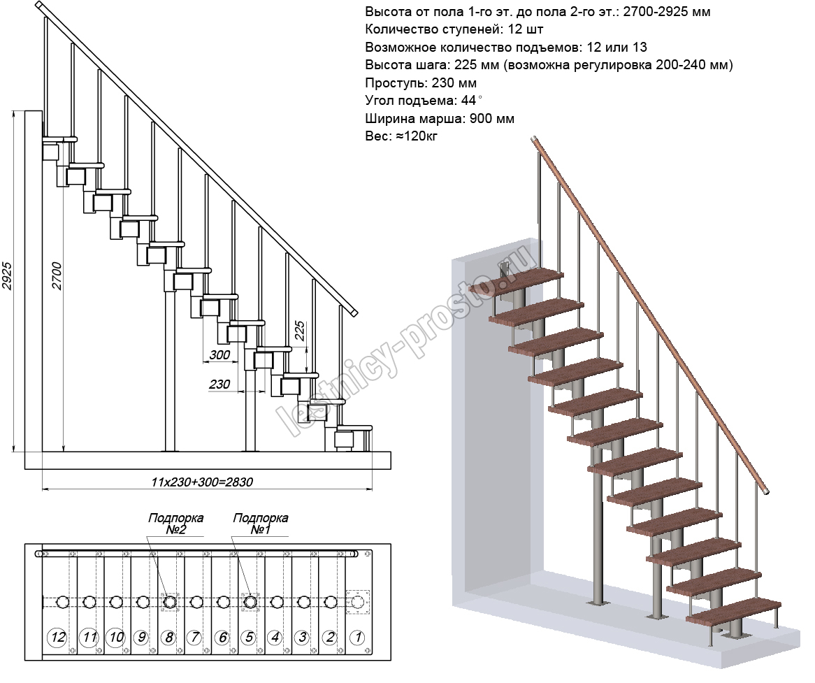 Высота лестницы 2700 - 2925 (12 ступеней) мм