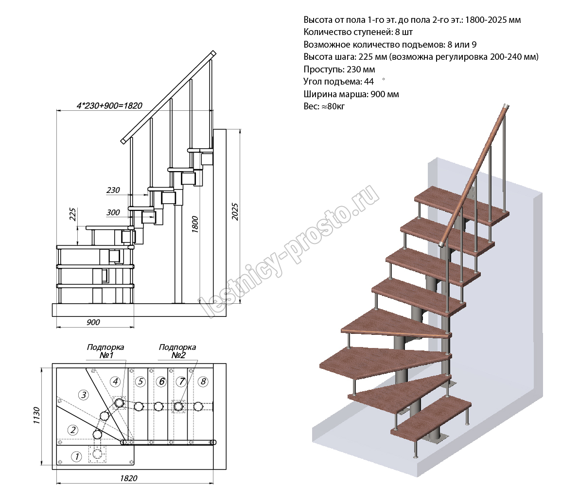 Высота лестницы 1800 - 2025 (8 ступеней) мм