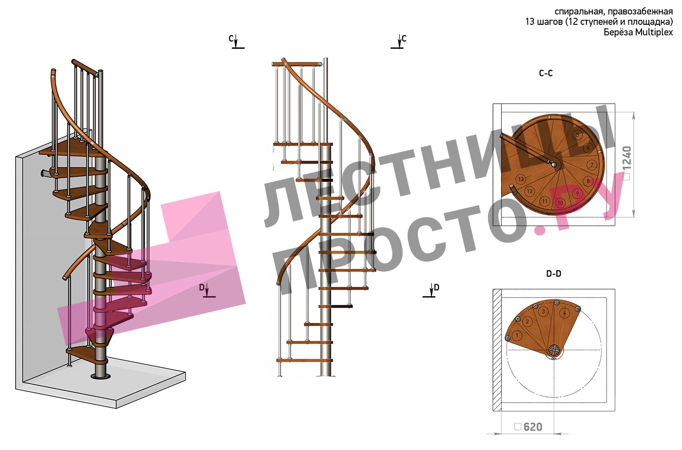 Ширина ступени между стойками и центральной колонной ≈ 48 см