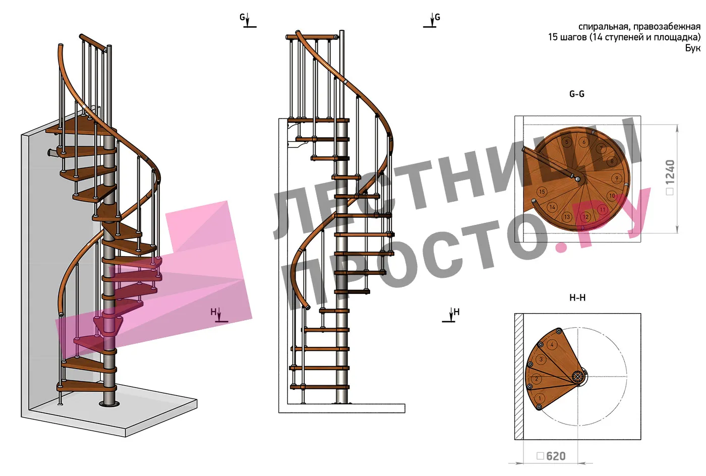 Решение о направлении поворота принимается при сборке лестницы - универсальная конструкция позволяет собрать правозабежную и левозабежную лестницы. Высота ступеней регулируется с шагом 3 мм. в пределах 217-247 мм., благодаря чему, лестница прекрасно подгоняется под необходимую высоту.