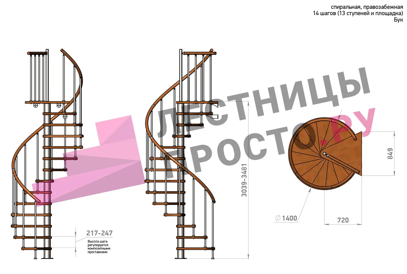 Решение о направлении поворота принимается при сборке лестницы - универсальная конструкция позволяет собрать правозабежную и левозабежную лестницы. Экономит пространство. Высота ступеней регулируется с шагом 3 мм. в пределах 217-247 мм., благодаря чему, лестница прекрасно подгоняется под необходимую высоту.