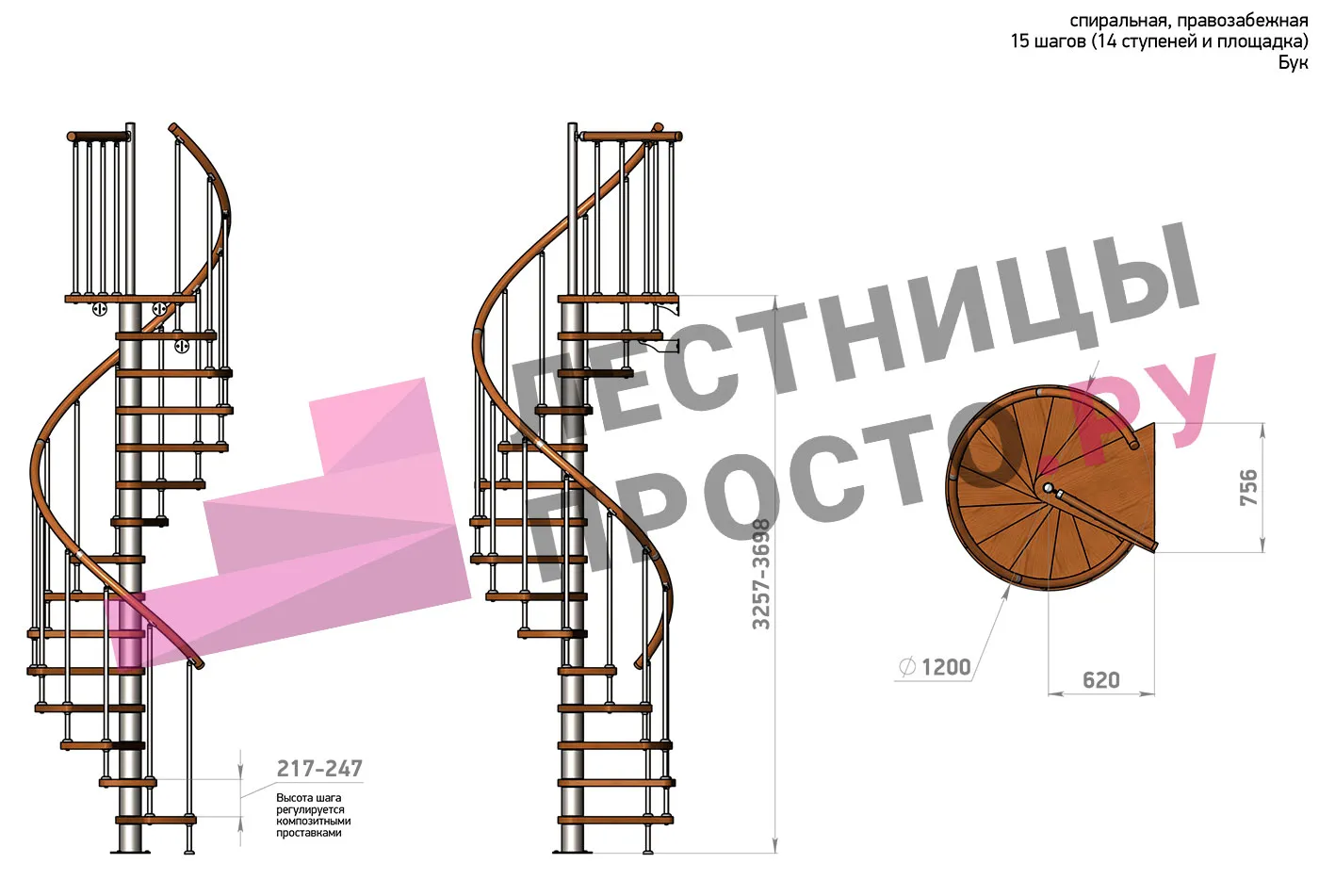 Решение о направлении поворота принимается при сборке лестницы - универсальная конструкция позволяет собрать правозабежную и левозабежную лестницы. Высота ступеней регулируется с шагом 3 мм. в пределах 217-247 мм., благодаря чему, лестница прекрасно подгоняется под необходимую высоту.