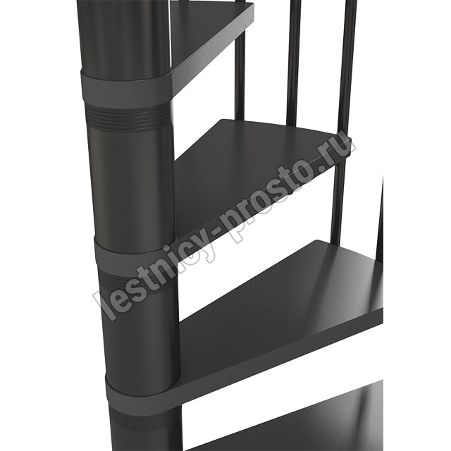 Ступени лестницы изготовлены из бука по технологии MULTIPLEX и покрыты износостойким защитным лаком. Лестница монтируется как по часовой стрелке, так и против. Возможен монтаж в круглый или квадратный проём. Ограждение: стальные трубки, Ø25 мм RAL 7016. Поручень: гибкий цельный ПВХ-поручень Ø40 мм антрацитового цвета. Конструкция и балюстрада окрашены порошковым способом в антрацитовый цвет (RAL 7016).
